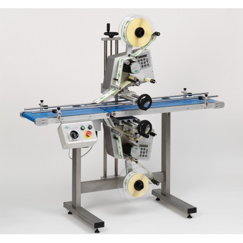 The dispensers are mounted on adjustable spindles, for easy adjustment of the desired label position. The bottom dispenser can glide out to the side of the conveyor frame, for easy change of label roll.